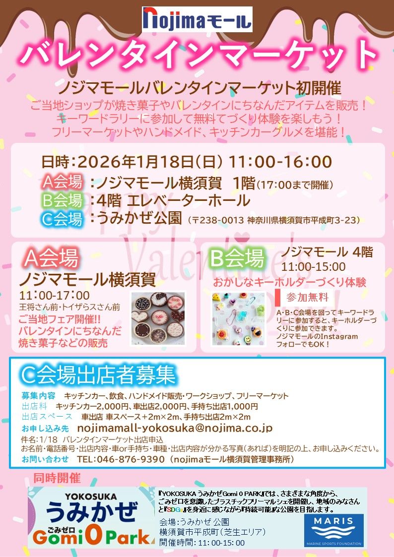 ノジマモール館内とうみかぜ公園でバレンタインマーケットを開催いたします。 ご当地ショップが焼き菓子やバレンタインにちなんだアイテムを販売! キーワードラリーに参加して無料てづくり体験を楽しもう! フリーマー...