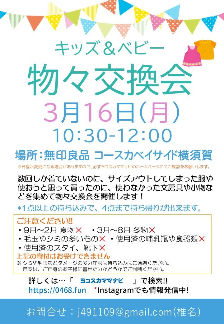 3月16日(月) 10:30~12:00 無印良品 コースカベイサイド横須賀店さんにご協力いただき、キッズ&ベビーの物々交換会を開催します。店頭では2021年7月12日(月)から洋服などの寄付の受付をスタートしています。 寄付していただく商品は無印良品の商品でなくても構いません。