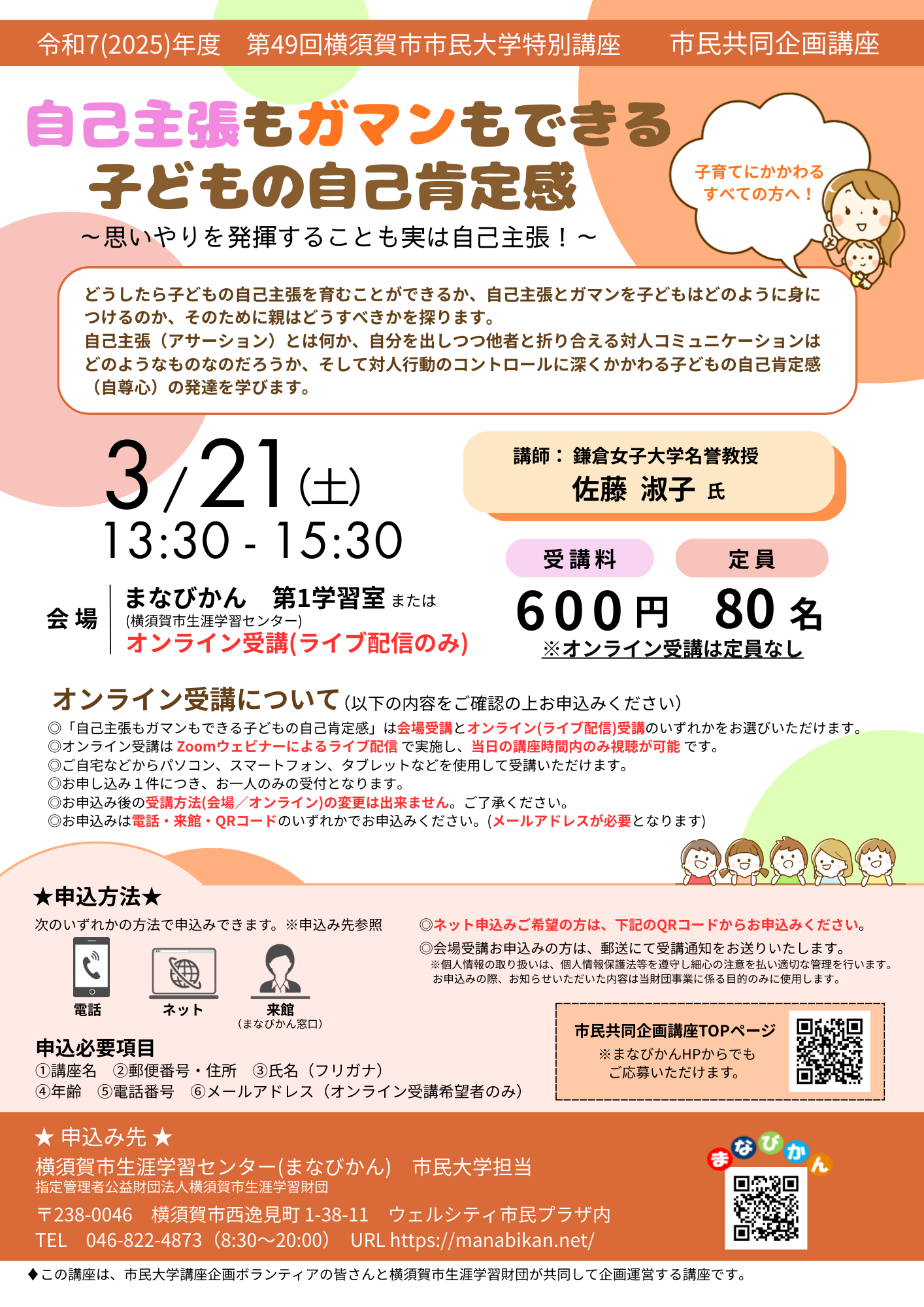 会場受講:電話、ネット、来館(まなびかん窓口) オンライン受講:ネットのみ ※問合せ先(まなびかん)までお申込みください。 |